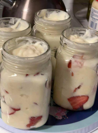 Wissel 1/3 kop yoghurtmengsel en blokjes aardbeien in elke pot af.