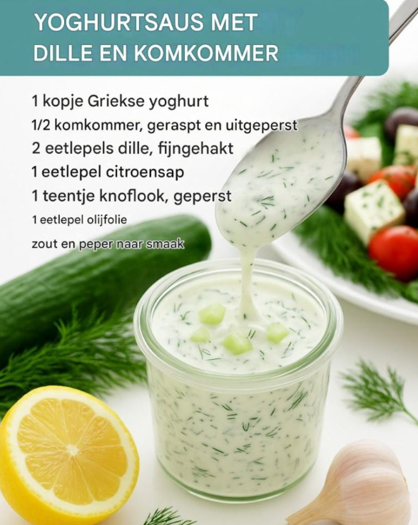 Doe de yoghurt, dille, knoflook (indien gebruikt), citroensap en olijfolie in een kom.