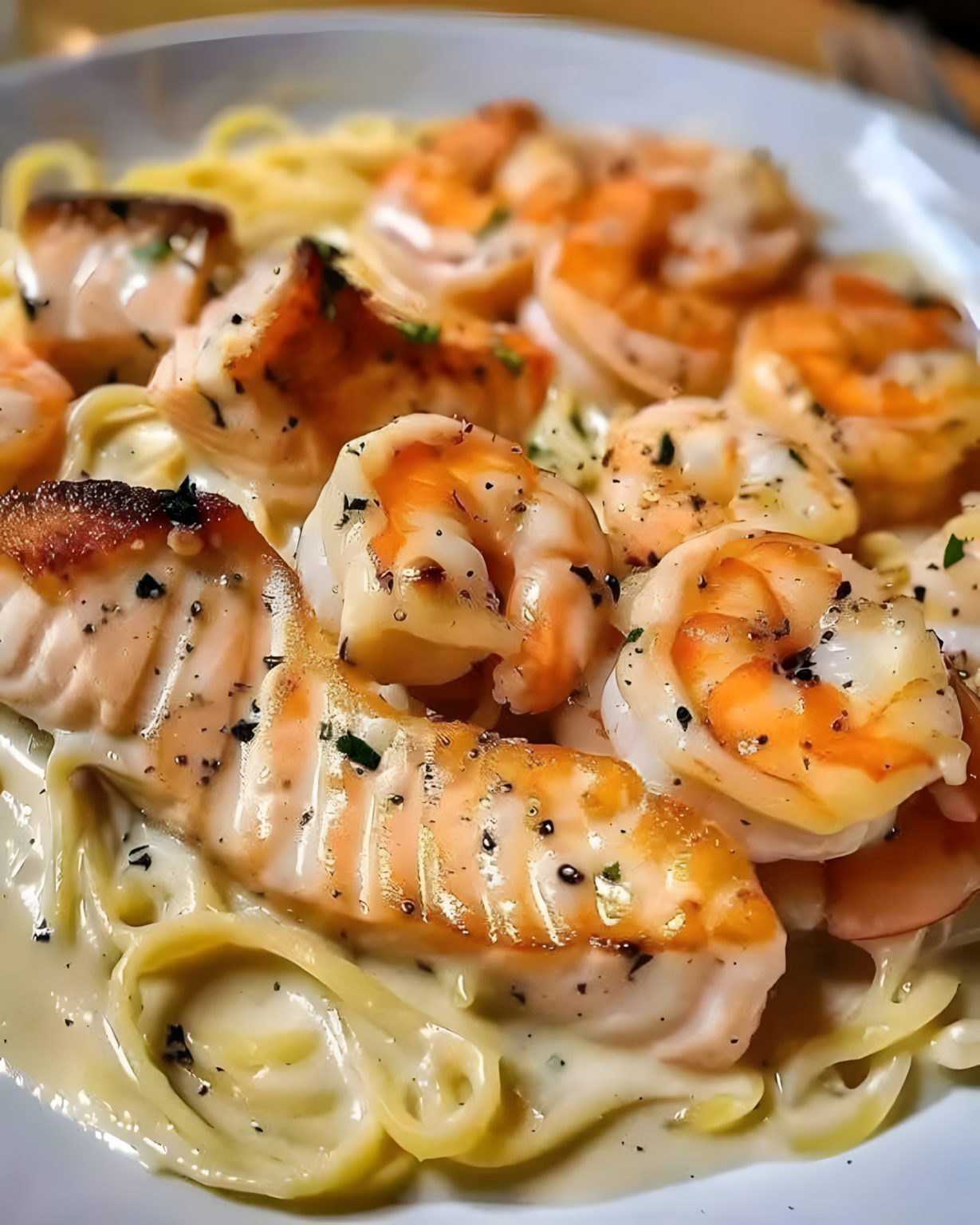 Een rijke, romige en verrukkelijke pasta met zeevruchten, met perfect gebakken zalm en garnalen in een luxueuze Parmezaanse Alfredo-saus. De perfecte comfortmaaltijd voor liefhebbers van zeevruchten!