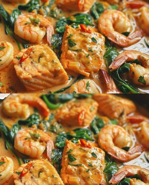 Zalm en Garnalen in Kokosmelk Saus met Spinazie