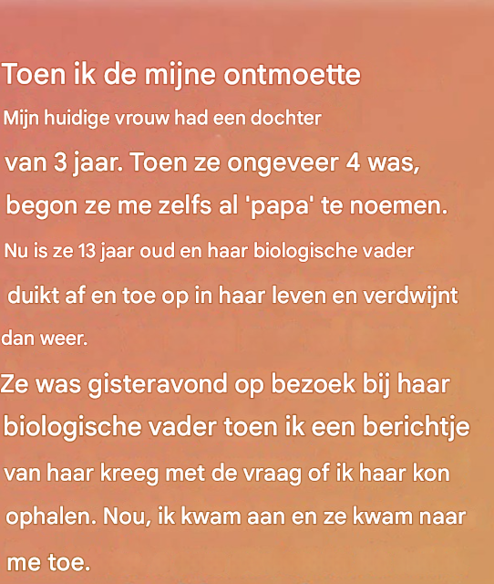 Ze was drie jaar oud toen ik haar ontmoette—krullen, een voorzichtige blik en een pluchen giraffe die als een harnas werd vastgeklemd. Toen ze vier jaar oud was, begon ze me zelf « papa » te noemen, alsof dat mijn altijd-naam was. Nu is hij dertien jaar oud. Haar biologische vader verschijnt en verdwijnt als slecht weer. Ze was gisteravond bij hem toen mijn telefoon oplichtte: