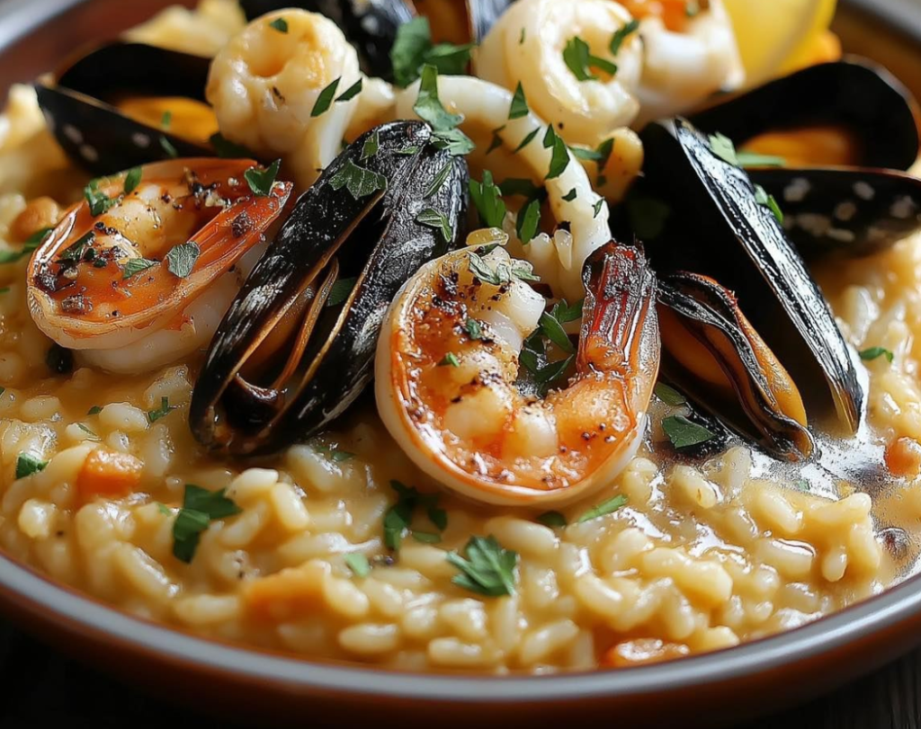 2. Zeevruchten: Fruit de knoflook in een koekenpan met een beetje olijfolie. Voeg de zeevruchten toe en bak ze 3 tot 4 minuten op hoog vuur. Haal de zeevruchten uit de pan en bewaar het kookvocht (dit geeft smaak aan de risotto).