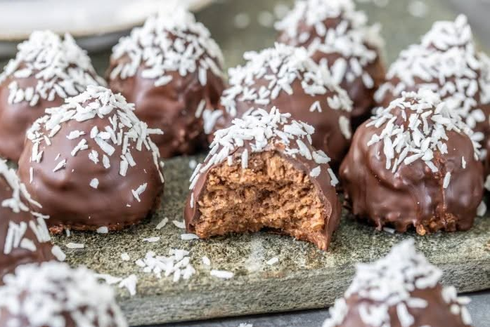 - Als de balletjes koud en stevig zijn, doop je ze in de gesmolten pure chocolade. Ik smelt de chocolade in een kom en doe deze vervolgens in een klein kopje, zodat het makkelijk dippen is. Na het dopen bestrooi je de balletjes met een beetje kokos voor een extra smaakdimensie.