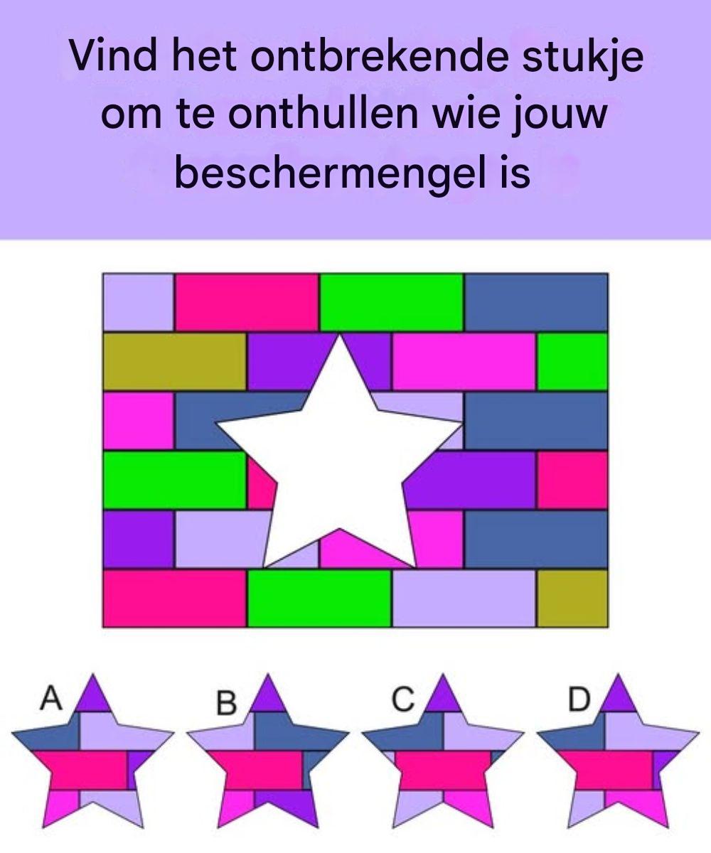 In deze visuele puzzel word je uitgenodigd om te onderzoeken wat voor soort beschermengel het beste aansluit bij jouw persoonlijkheid en levenspad. Het ontwerp presenteert een kleurrijk mozaïek met de vorm van een ster die in het midden ontbreekt. Hieronder zijn vier mogelijke stervormige stukken getoond. De uitdaging is simpel: kies het sterstuk dat voor jou goed voelt. De beslissing die je neemt – zelfs als deze snel of intuïtief wordt geselecteerd – kan iets onthullen over de kwaliteiten die je zoekt of de begeleiding die bij je past.